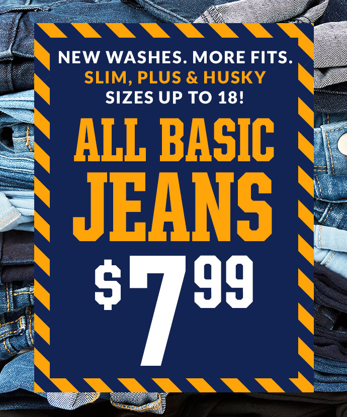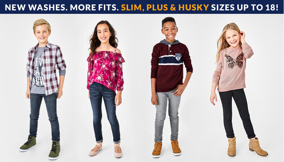 - The Children’s Place has the newest denim fits and washes kids want, from classic bootcut jeans, to skinny jeans and all the latest jean trends, in just about every size, from 6 months to size 18 (including Plus, Slim and Husky fits!) Pair them with tees, button-downs, blazers, sweaters and more.